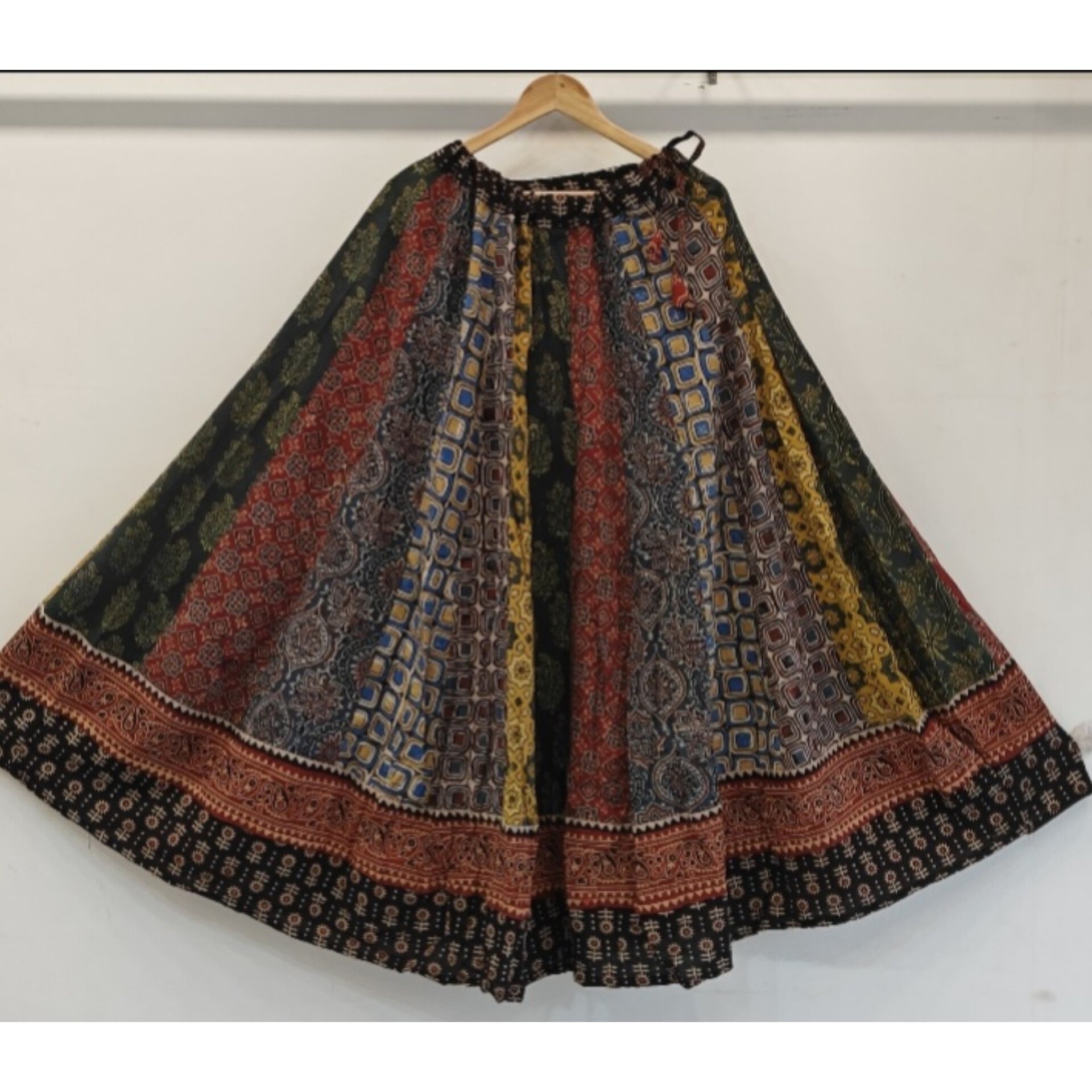 Step into the festive spirit with our Ajrakh Handblock Print Natural Cotton Panel Chaniya Skirts. Crafted with a beautiful natural double border and double Kangri strip, these skirts bring tradition to life. With a comfortable waist fit up to 44″+, a length of approximately 41 inches, and a stunning flair of over 5 meters, they’re perfect for twirling through Navratri nights.