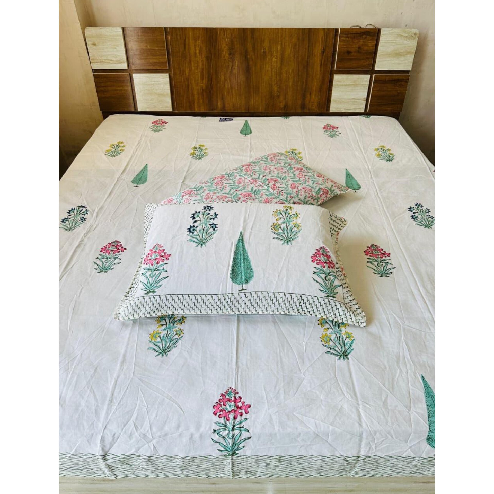 Upgrade your bedroom with this elegant handblock 300TC double bedsheet set, crafted from soft, fine-quality cotton for a comfortable feel. Measuring 100 ×108 inches (8 ft by 9 ft), it offers generous coverage, while the two matching pillow covers (19 × 29 inches with flap) complete the look beautifully.This bedsheet is machine washable and weighs approximately 1.3 kg, making it both practical and durable.