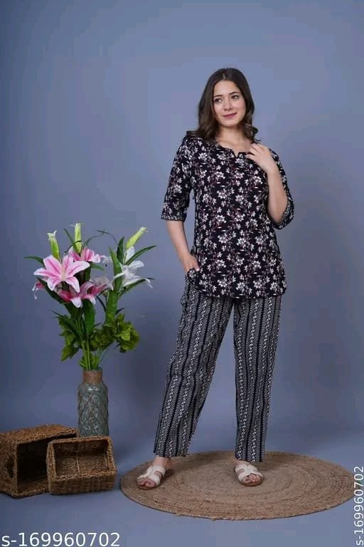 This stylish printed cotton night suit for women is perfect for day and night wear. Made from soft, breathable cotton fabric, it offers maximum comfort at home or while sleeping. The set includes a regular top with three-quarter sleeves and matching pyjamas. Available sizes: S(36), M(38), L(40), XL(42), XXL(44), and XXXL(46). Designed with attractive prints and a relaxed fit, it’s an ideal choice for comfortable daily wear.