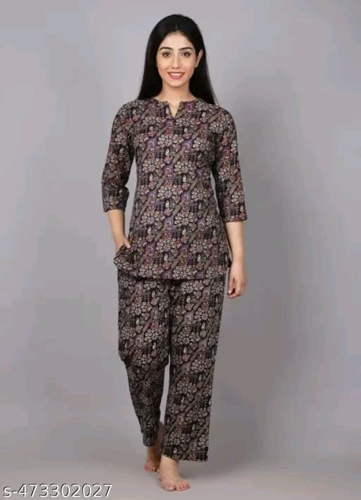 Stay cozy and stylish with this trendy and comfortable night suit for girls and women. Made from soft rayon fabric, it features a printed regular top with three-quarter sleeves and matching pyjamas. The set is available in sizes: