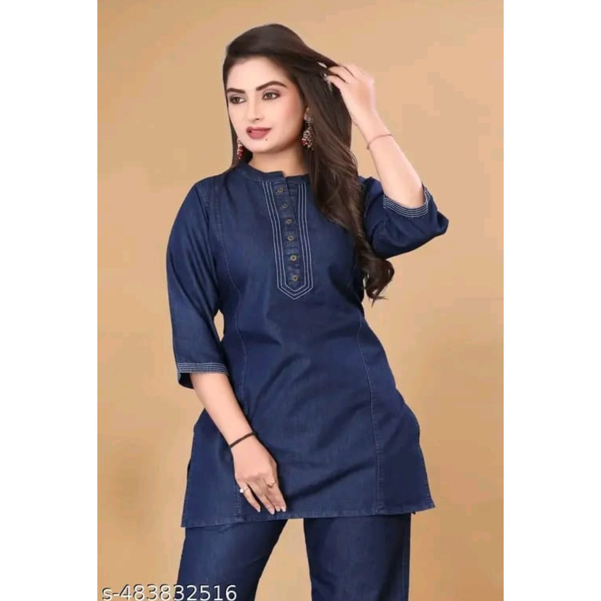 Upgrade your everyday style with this Denim Co-ord Set for Women, featuring a trendy kurti-style top with 3/4 sleeves and matching straight-fit denim pants. Made from premium cotton-based denim, it offers a breathable, soft, and durable fit — ideal for casual outings, office wear, or western-themed events. The front button placket, and contrast stitching add a fashionable touch. All tops have a length of 32 inches, and pants have a length of 38 inches. Available in sizes S to 5XL, it fits a wide range of body types: