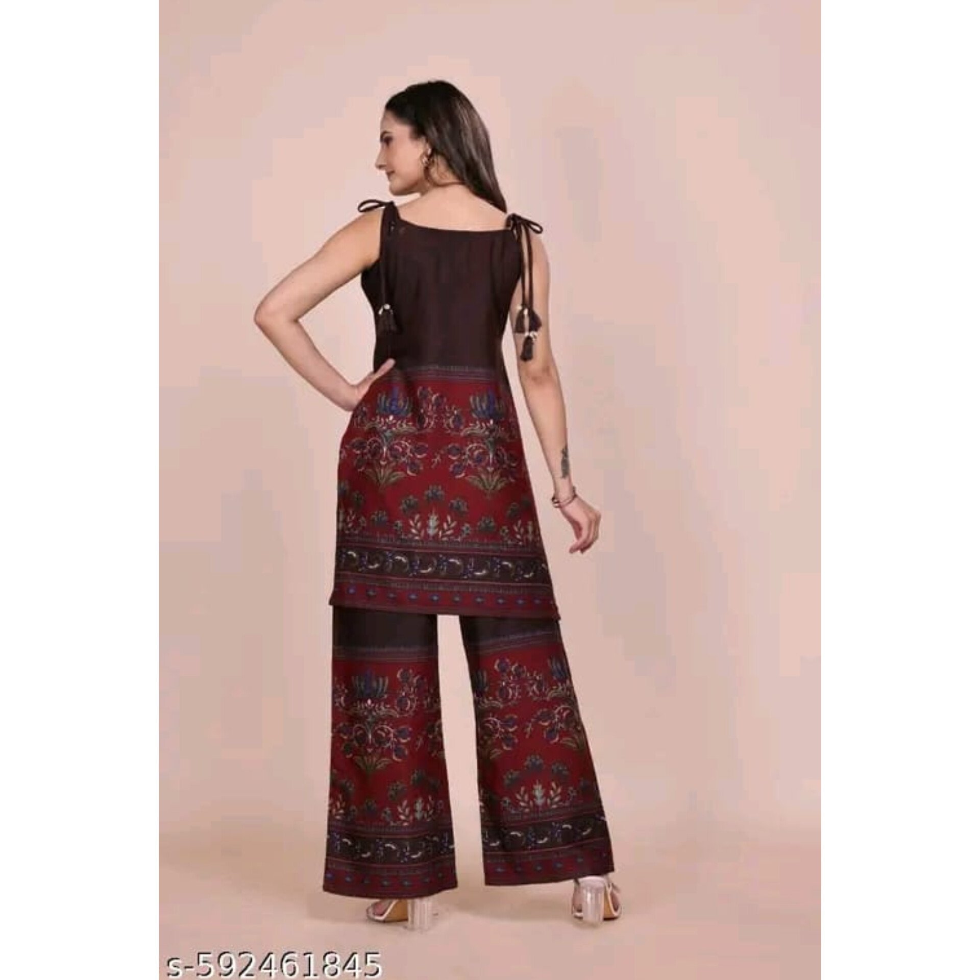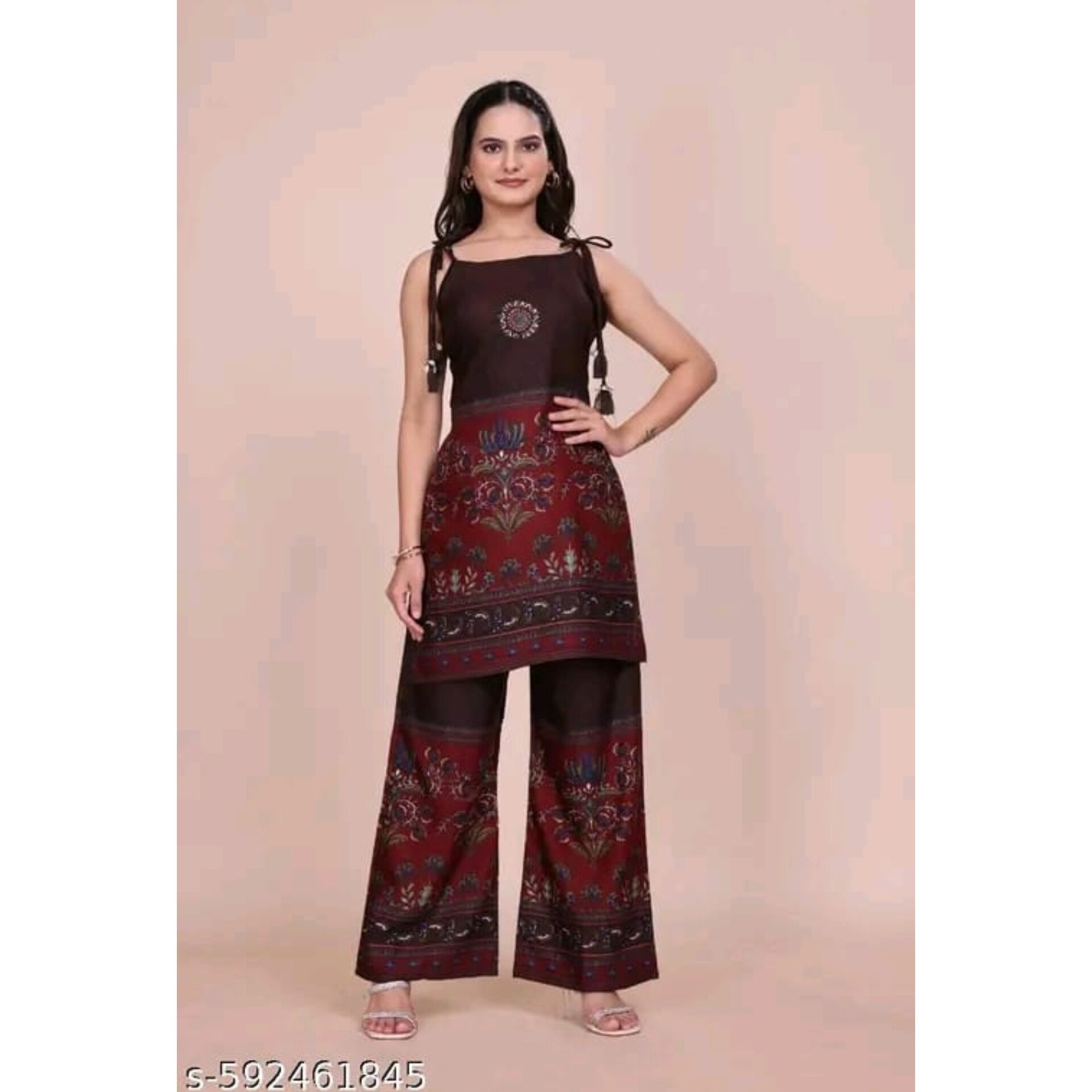 This trendy rayon kurti with matching palazzo set offers the perfect blend of comfort and style. Crafted from soft, breathable rayon fabric, it features beautiful floral and ethnic prints that add a modern ethnic charm. The sleeveless kurti comes with stylish tie-up straps and is paired with coordinated palazzo pants for a stylish yet comfortable fit. Perfect for any casual outing and festive gathering. Available in sizes: