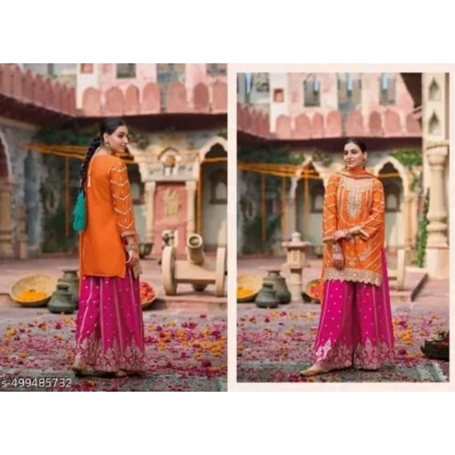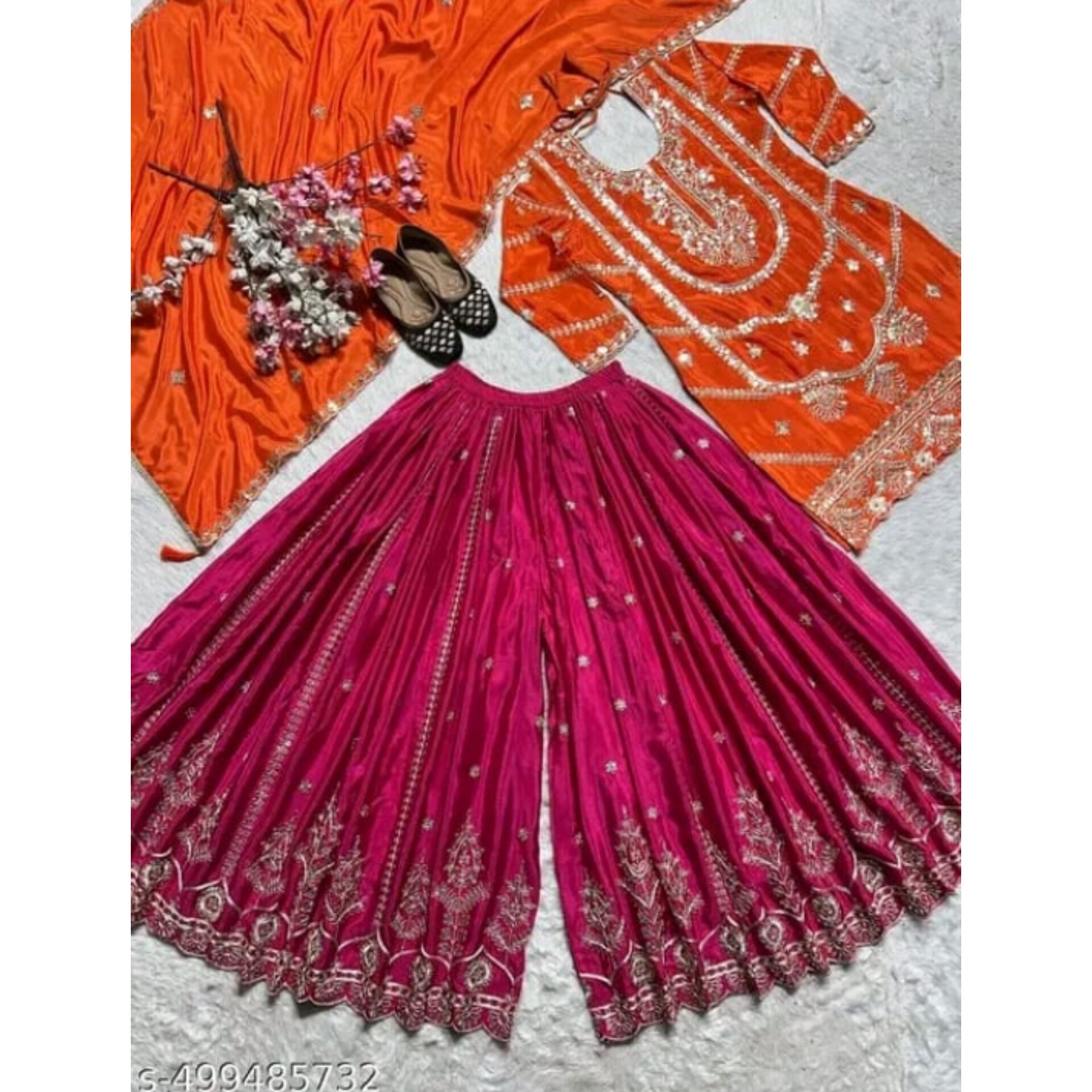 This pink sharara suit paired with a bold orange top, perfectly combining modern charm with traditional elegance. Made from pure heavy Chinnon silk, the kurta features detailed embroidery with coding sequence work and embroidered three-quarter sleeves, lined with soft micro cotton for comfort. The fully stitched palazzo, also crafted from heavy Chinnon silk with matching embroidery, comes with a micro cotton inner and measures 38 inches in length for all sizes. The 2.30-meter dupatta completes the look with beautiful embroidery and a four-side lace border. The top length is 38–39 inches. Available in sizes
