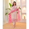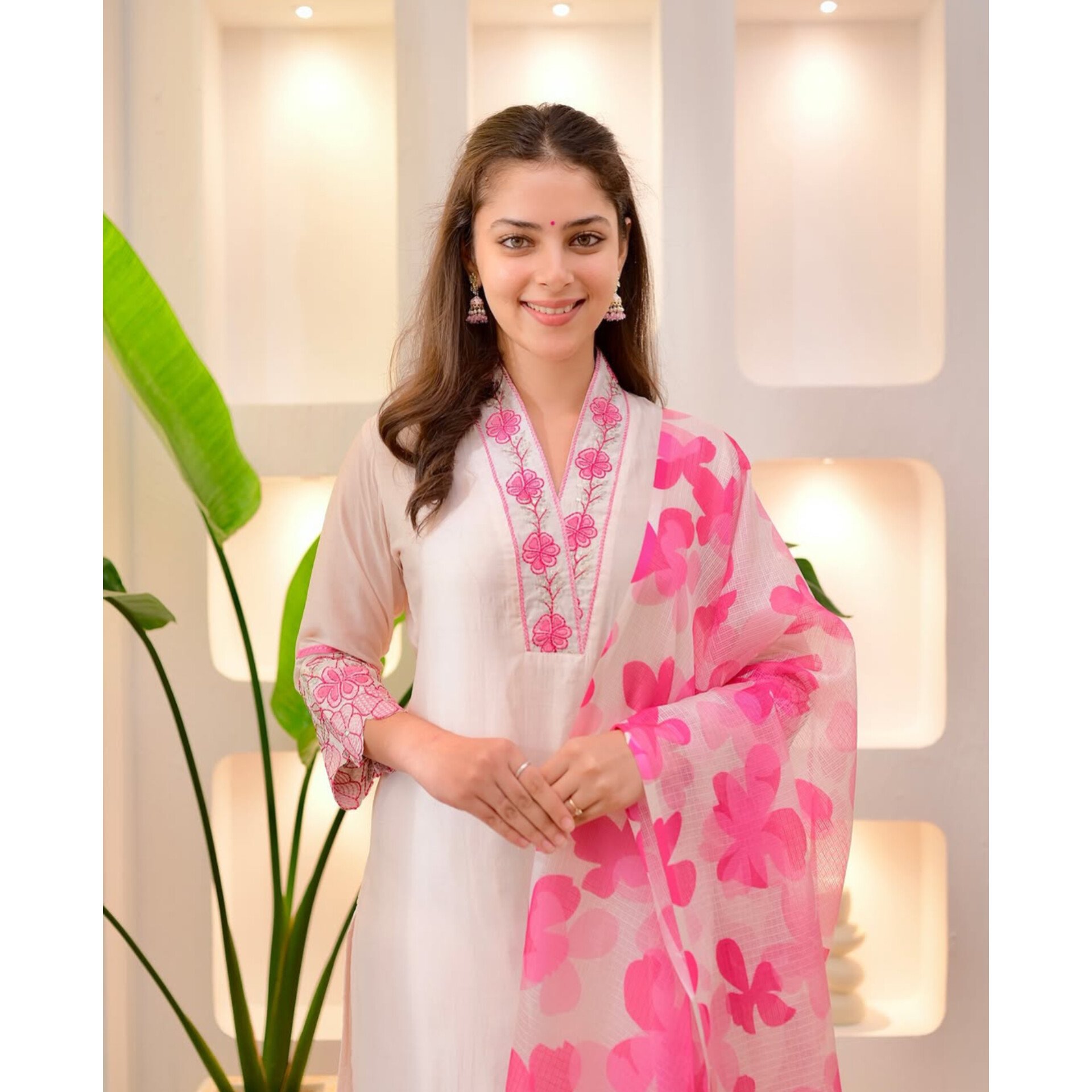 Introducing a stunning 3-piece set, perfect for the festive season. Crafted in premium cotton flex, this elegant outfit features a beautifully embroidered kurta with intricate zari work on the neckline, sleeves, and daaman. It is paired with a comfortable matching pant and a soft Kota Doriya dupatta adorned with delicate floral prints, blending traditional charm with modern elegance. The kurti length is 46 inches, and the pant length is 38 inches. Available in sizes M (38), L (40), XL (42), XXL (44), and XXXL (46).