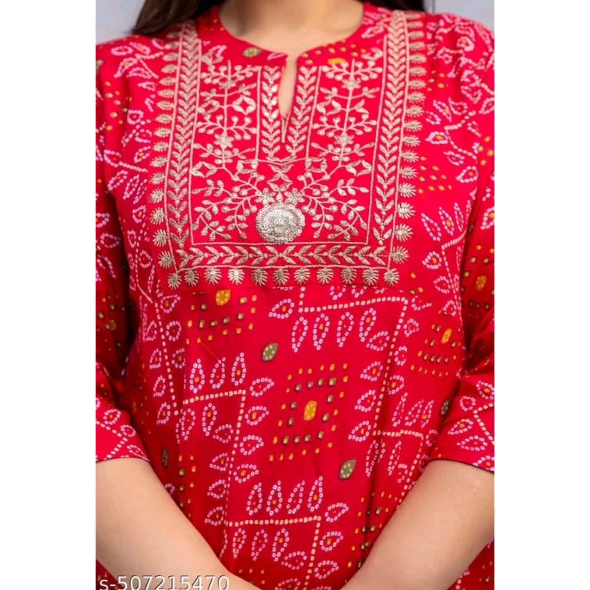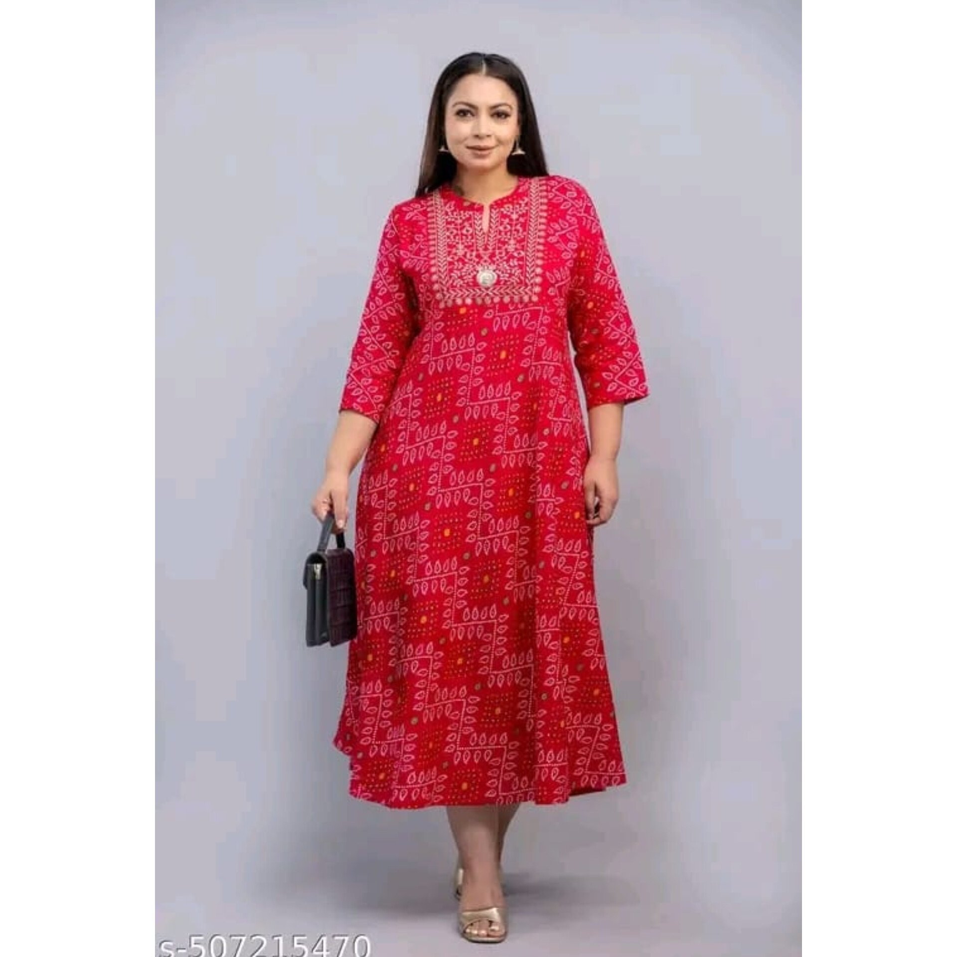 Make a statement with our Bandhani Embroidered Plus-Size Kurti Dress, crafted from soft and breathable viscose rayon . Featuring a vibrant red color with traditional Bandhani-inspired prints, it is beautifully enhanced with delicate embroidery and mirror work on the yoke. Designed in a flattering Anarkali silhouette with three-quarter sleeves and a uniform length of 48 inches across all sizes, this kurti offers both elegance and ease. Perfect for festive events and casual outings. Available in inclusive plus sizes: