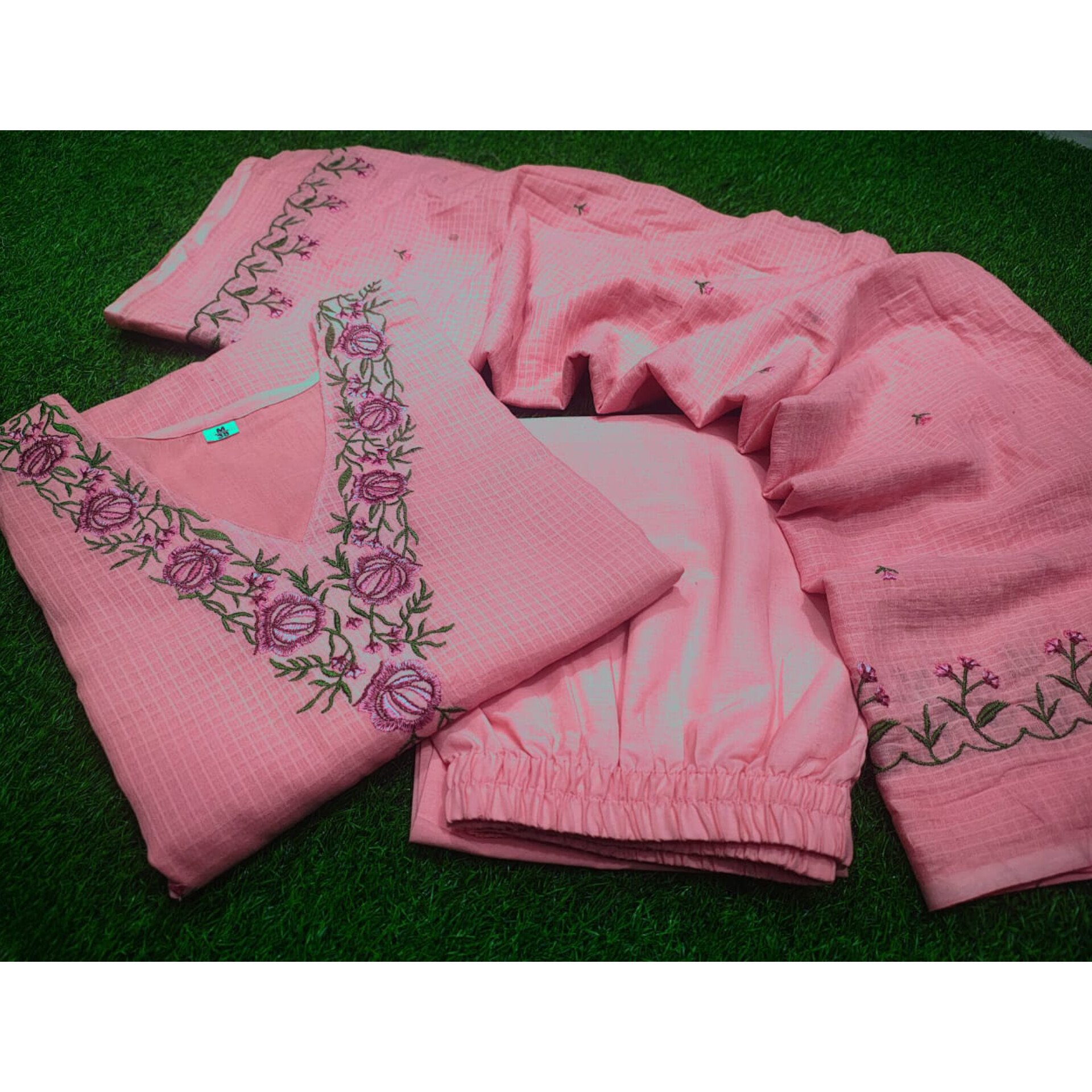 Refresh your wardrobe with our elegant Pure Soft Kota Doriya Kurti Set. The kurti features heavy intricate embroidery all over, paired with a comfortable cotton lining for effortless wear. It comes with a full-size Kota Doriya dupatta with delicate embroidery and scalloped edges, along with matching cotton pants for a complete and graceful look. Available in sizes M (38), L (40), XL (42), and XXL (44) — perfect for timeless elegance and all-day comfort.