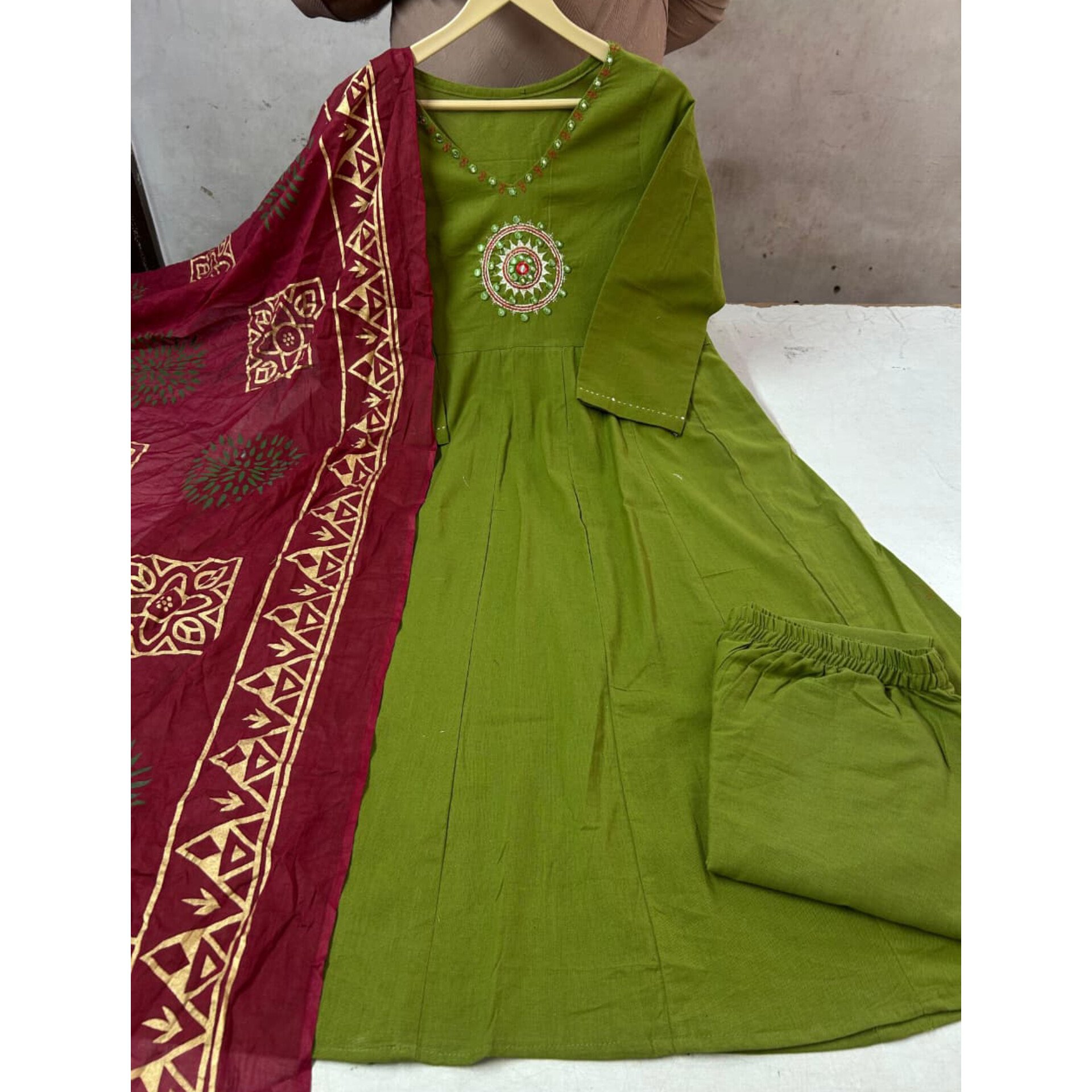 This beautiful Anarkali Set features intricate mirror work that adds the perfect spark for any festive gathering. Crafted in comfortable Cotton Flex fabric, each set includes a 45-inch kurti, 39-inch pants, and a 2.25-meter dupatta—designed to blend style with grace. Available in sizes: M (38), L (40), XL (42), XXL (44), and XXXL (46).