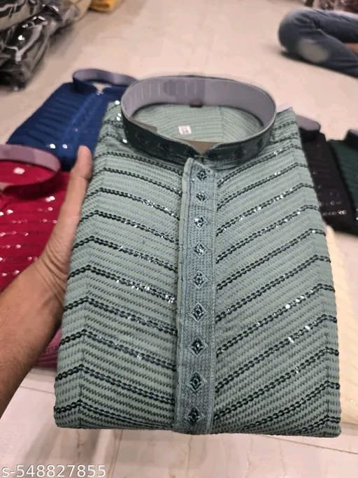 Elevate your ethnic style with this men’s viscose rayon kurta, designed for weddings and festive occasions. Made from soft, breathable fabric, it ensures all-day comfort while offering a smooth, elegant finish. The kurta features a beautifully embroidered Lucknowi-inspired zigzag pattern, a classic mandarin collar, and full sleeves for a refined traditional look. Available in sizes S (Chest: 39 in, Length: 39 in) and L (Chest: 43 in, Length: 40 in), it offers a flattering fit for various body types. Pair it with churidars, pajamas, or trousers for a timeless ensemble that blends tradition, style, and comfort effortlessly.