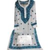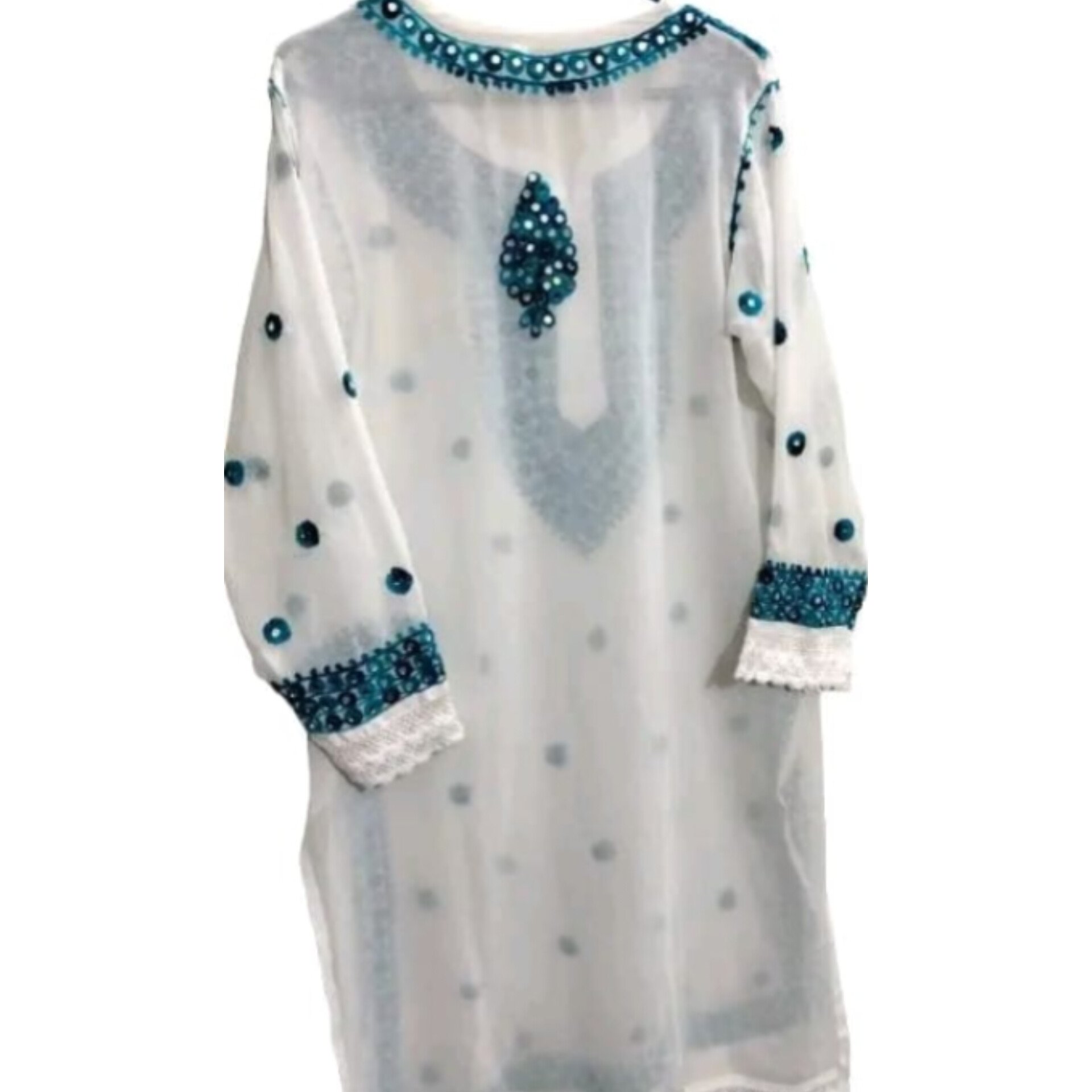 This Lucknowi Chikankari kurti features delicate mirror work with sequin-thread detailing, adding a touch of elegance to any outfit. Made from soft and flowy georgette fabric, it has three-quarter sleeves for a stylish yet comfortable look. The kurti comes in a uniform length of 43 inches for all sizes and is available in L (Bust 40 in), XL (Bust 42 in), and XXL (Bust 44 in), making it perfect for both casual and festive occasions.