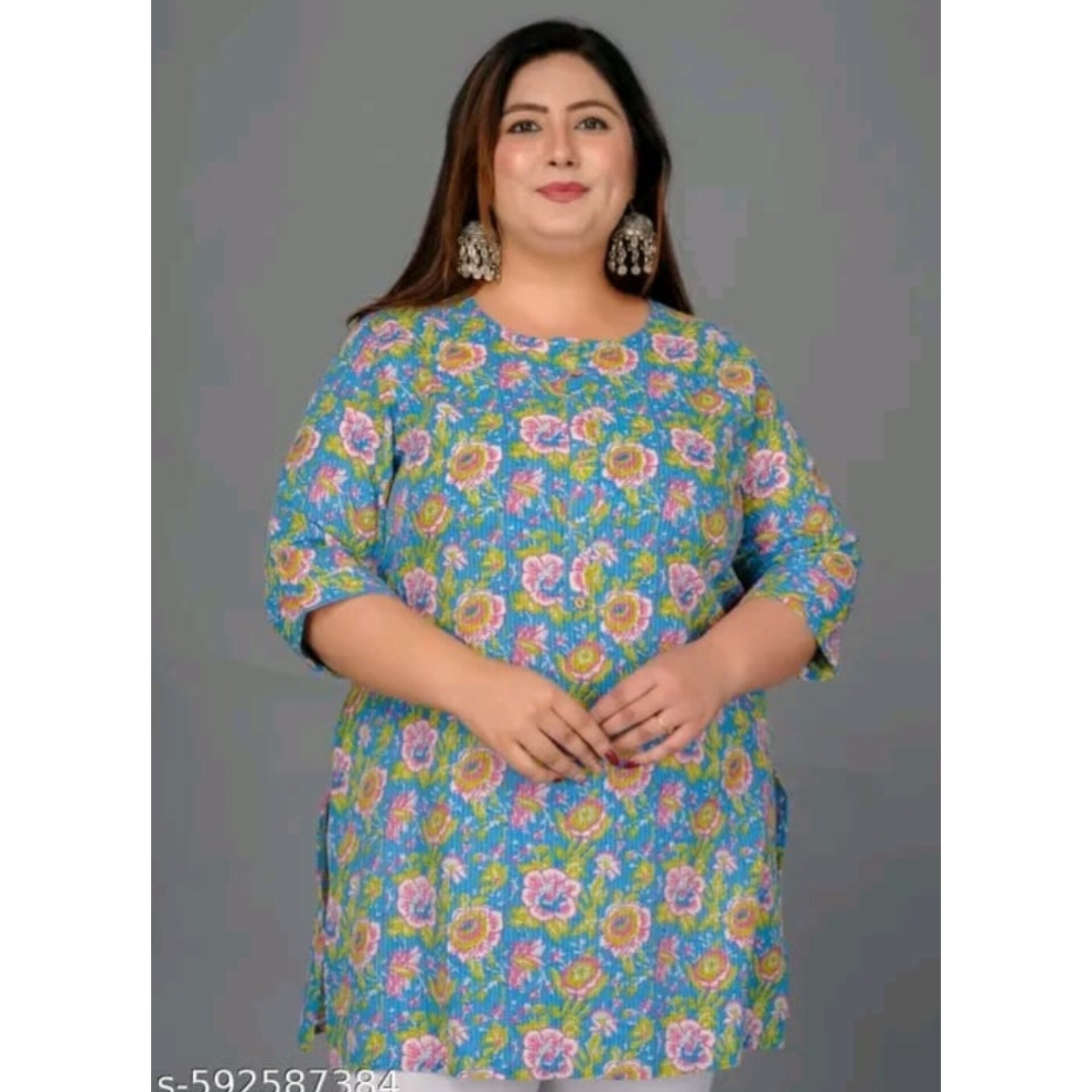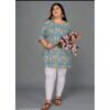 This Cotton Plus Size Short Kurta for women is made from soft, breathable cotton and features a stylish printed design with comfortable three-quarter sleeves. Ideal for everyday wear, it comes as a single piece and is available in a range of plus sizes: 3XL – 46 in, 4XL – 48 in, 5XL – 50 in, 6XL – 52 in, and 7XL – 54 in (bust size). The length of the kurta is 34 inches, providing a flattering and comfortable fit for all body types.