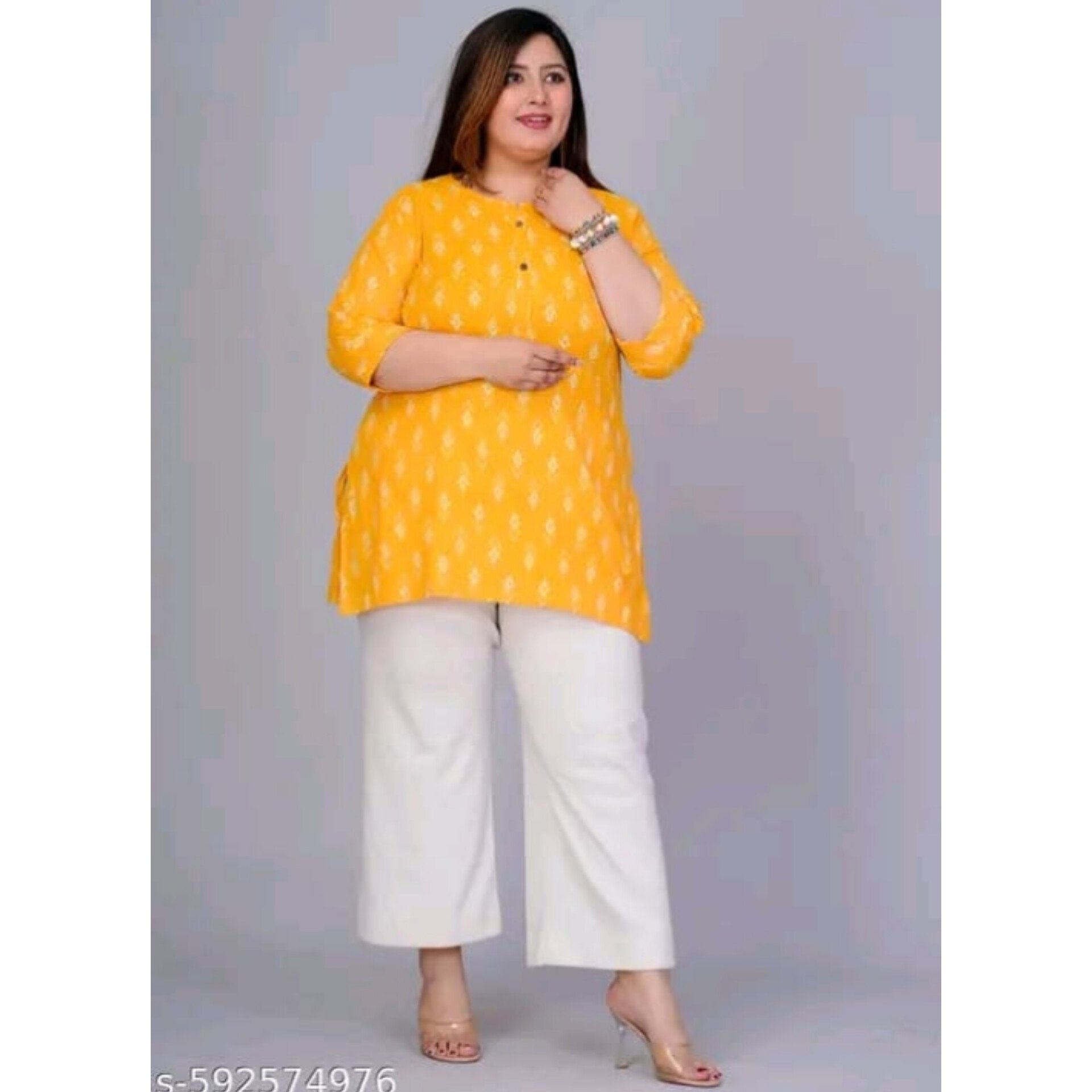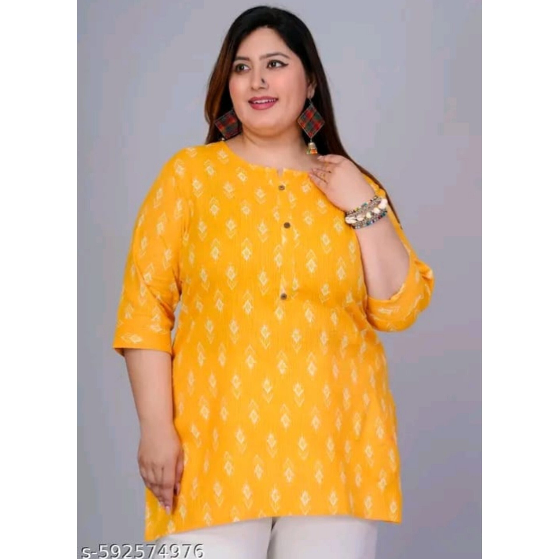 This Cotton Plus Size Short Kurta for women is made from soft, breathable cotton and features a stylish printed design with three-quarter sleeves. Ideal for casual or daily wear, this single-piece kurta combines comfort with effortless style. It is available in size 7XL, which fits a bust size of 54 inches and has a length of 34 inches, offering a comfortable and flattering fit for plus-size wearers.