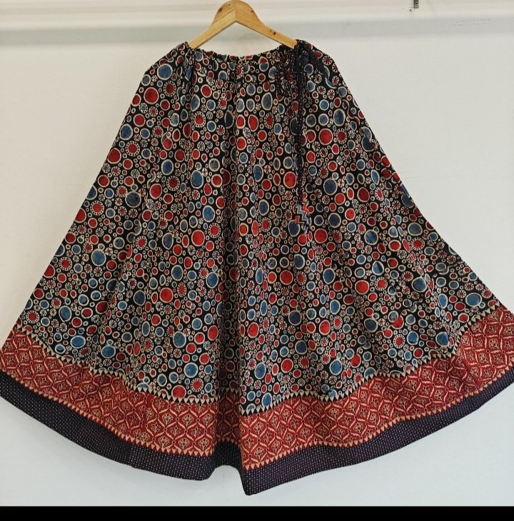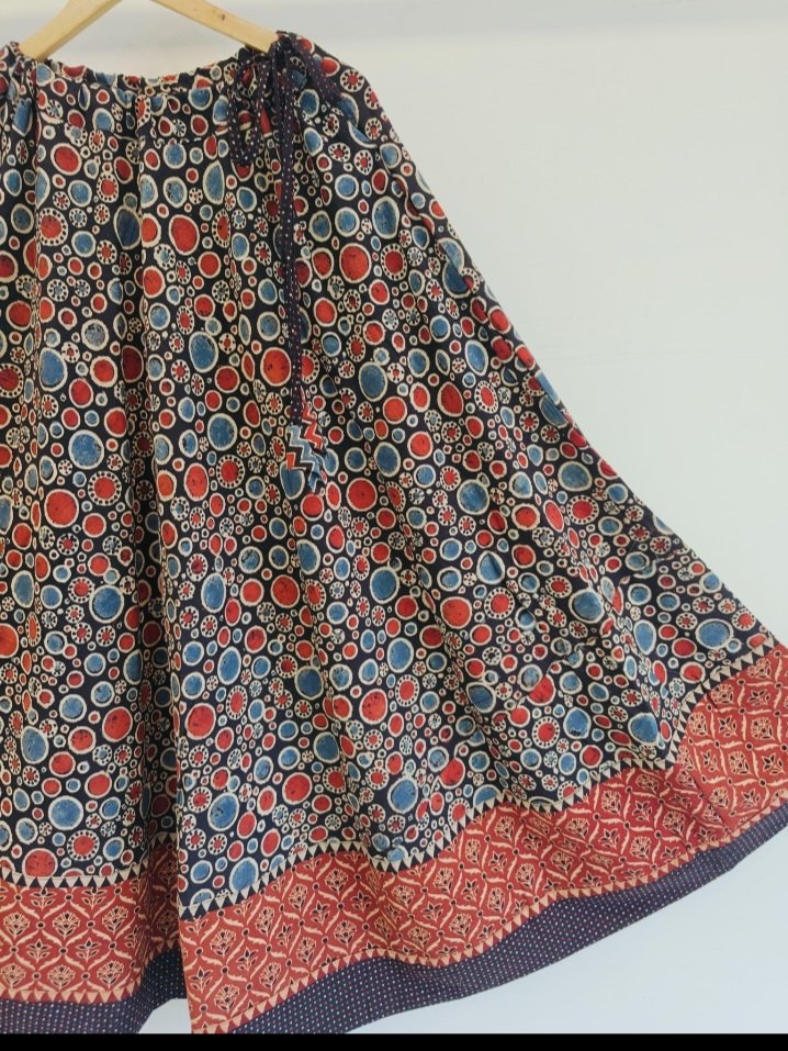 Step into the festive spirit with our stunning Cotton Ajrakh Natural Dye Handblock Print Skirts! Crafted with care using traditional handblock techniques and eco-friendly natural dyes, With an impressive 4.5-meter flare, this skirt is perfect for Garba nights and cultural events. The length is approximately 40 inches, offering graceful coverage while allowing ease of movement. It’s a free size fit (up to 44 inches), complete with an adjustable drawstring waistband and decorative tassels for a flattering fit on all body types. You can even pair with a crop top or choli for traditional festivals and dance nights. A kurti or long shrug for a fusion Indo-western vibe or even wear it as a lehenga with a dupatta for intimate celebrations.