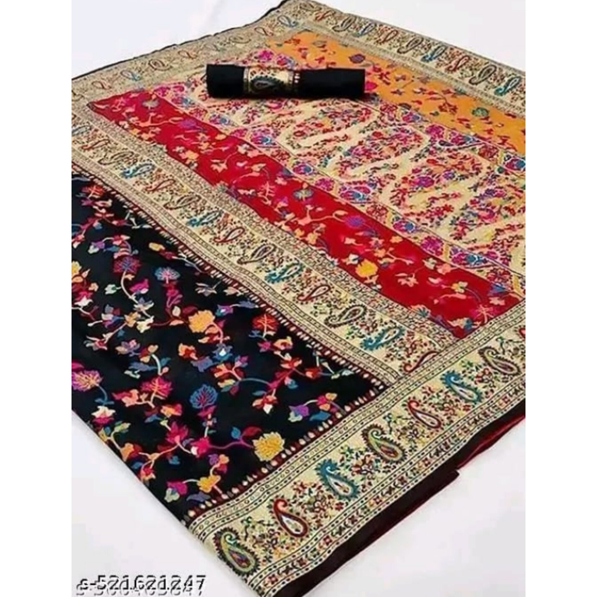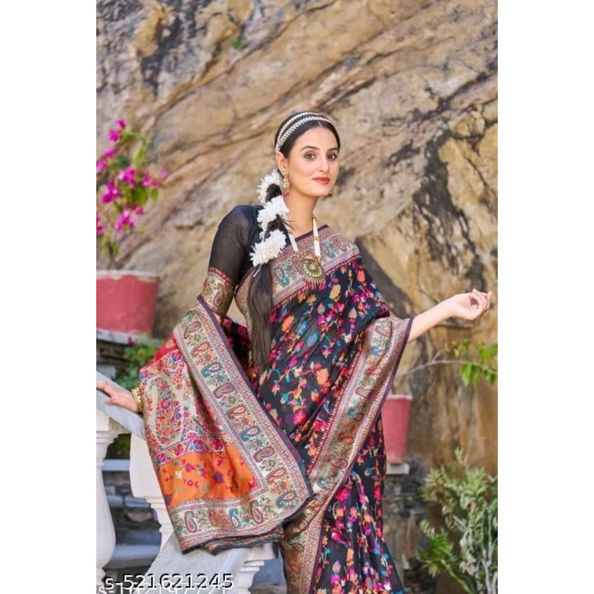 This fabulous Pashmina saree is crafted from a luxurious silk blend and features stunning multicolour weaves with rich gold zari work, making it a perfect choice for party wear or special occasions. The saree comes with a matching running blouse made from soft Pashmina fabric. With a saree length of 5.5 meters and a blouse length of 0.8 meters, it offers a comfortable free-size fit. Inspired by traditional Kashmiri handloom weaving, this elegant piece blends classic craftsmanship with a modern touch.