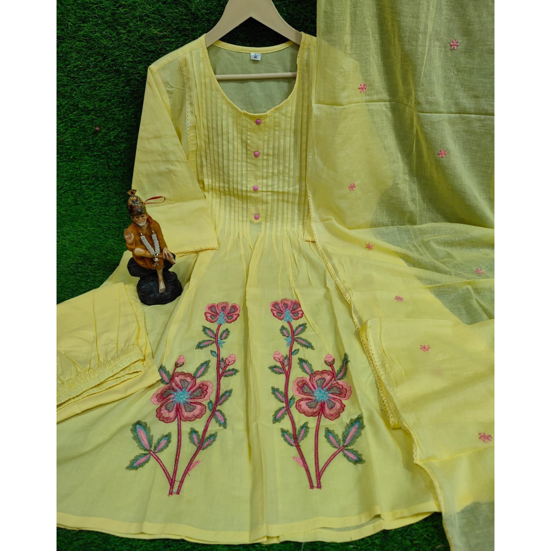 This Pure Cotton Kurta Set features elegant Pintex work on the neckline, enhanced with beautiful embroidery and lace detailing. Paired with a comfortable cotton pant featuring embroidery work and a full-length 2.25-meter dupatta, this ensemble is perfect for festive outings or vacation wear. Available in sizes M (38), L (40), XL (42), and XXL (44). With a kurti length of 45″ and bottom length of 38″, it’s crafted for both style and comfort.