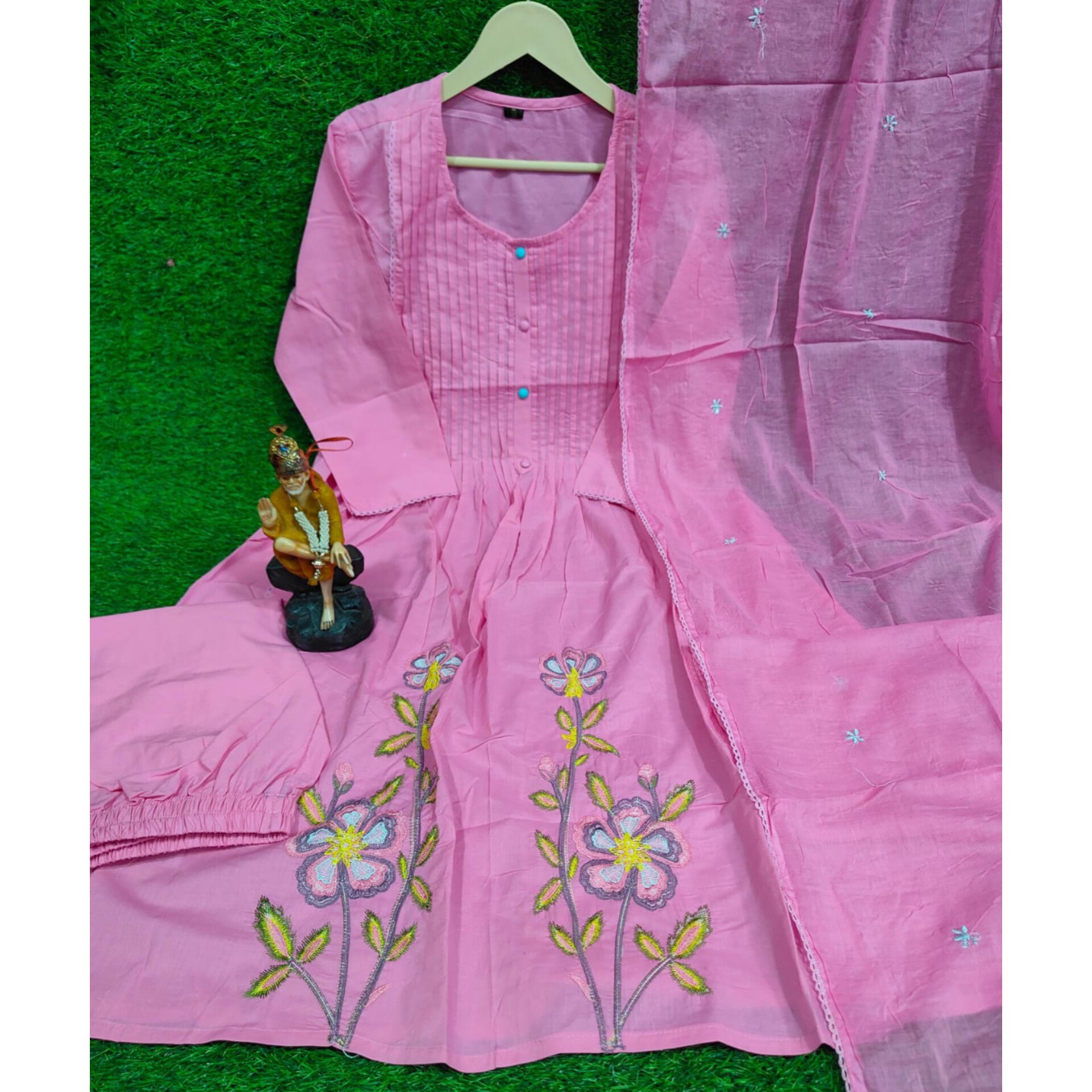 This Pure Cotton Kurta Set features elegant Pintex work on the neckline, enhanced with beautiful embroidery and lace detailing. Paired with a comfortable cotton pant featuring embroidery work and a full-length 2.25-meter dupatta, this ensemble is perfect for festive outings or vacation wear. Available in sizes M (38), L (40), XL (42), and XXL (44). With a kurti length of 45″ and bottom length of 38″, it’s crafted for both style and comfort.
